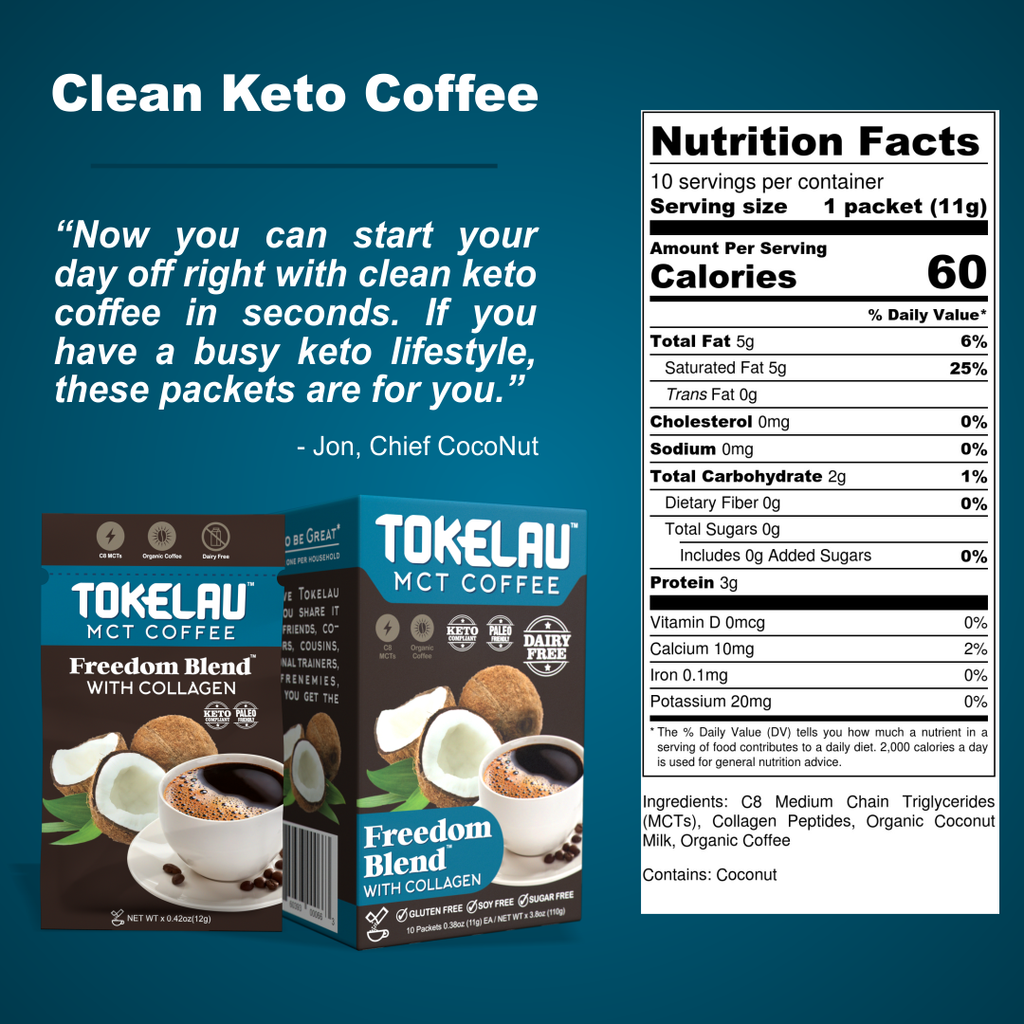 These dairy-free + collagen clean keto coffee packets will help you stay keto when you're traveling, camping, or just plain busy. Each packet has everything you need to include organic coffee, C8 MCTs, grassfed collagen and...