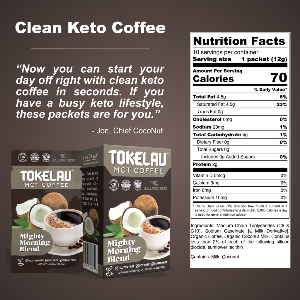 Fuel your busy keto lifestyle with our Mighty Morning Blend clean keto coffee packets. They will help you stay keto when you're traveling, camping, or just plain busy. Each packet has everything you need to include organic...